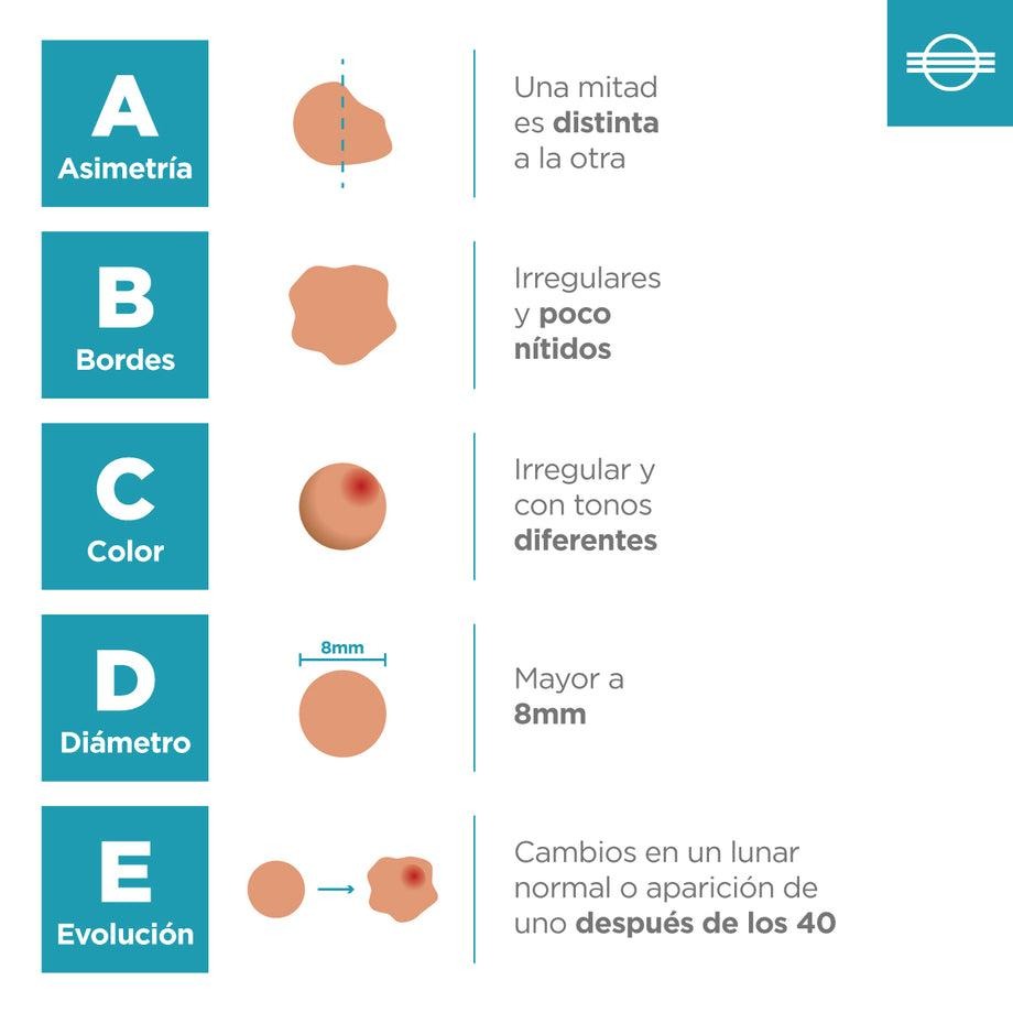 El ABCDE de los lunares es una regla mnemotécnica que nos permite de una forma sencilla saber qué tipo de cosas tenemos que tener en cuenta a la hora de explorar y analizar los lunares que tenemos en nuestro cuerpo.A – Asimetría: si partimos en dos el lunar, una mitad es diferente a la otra.